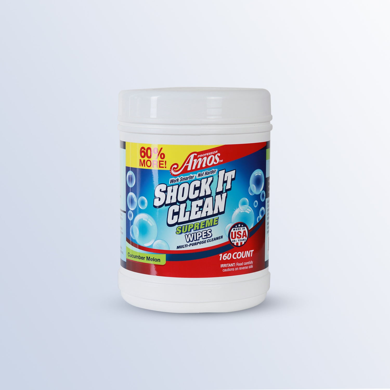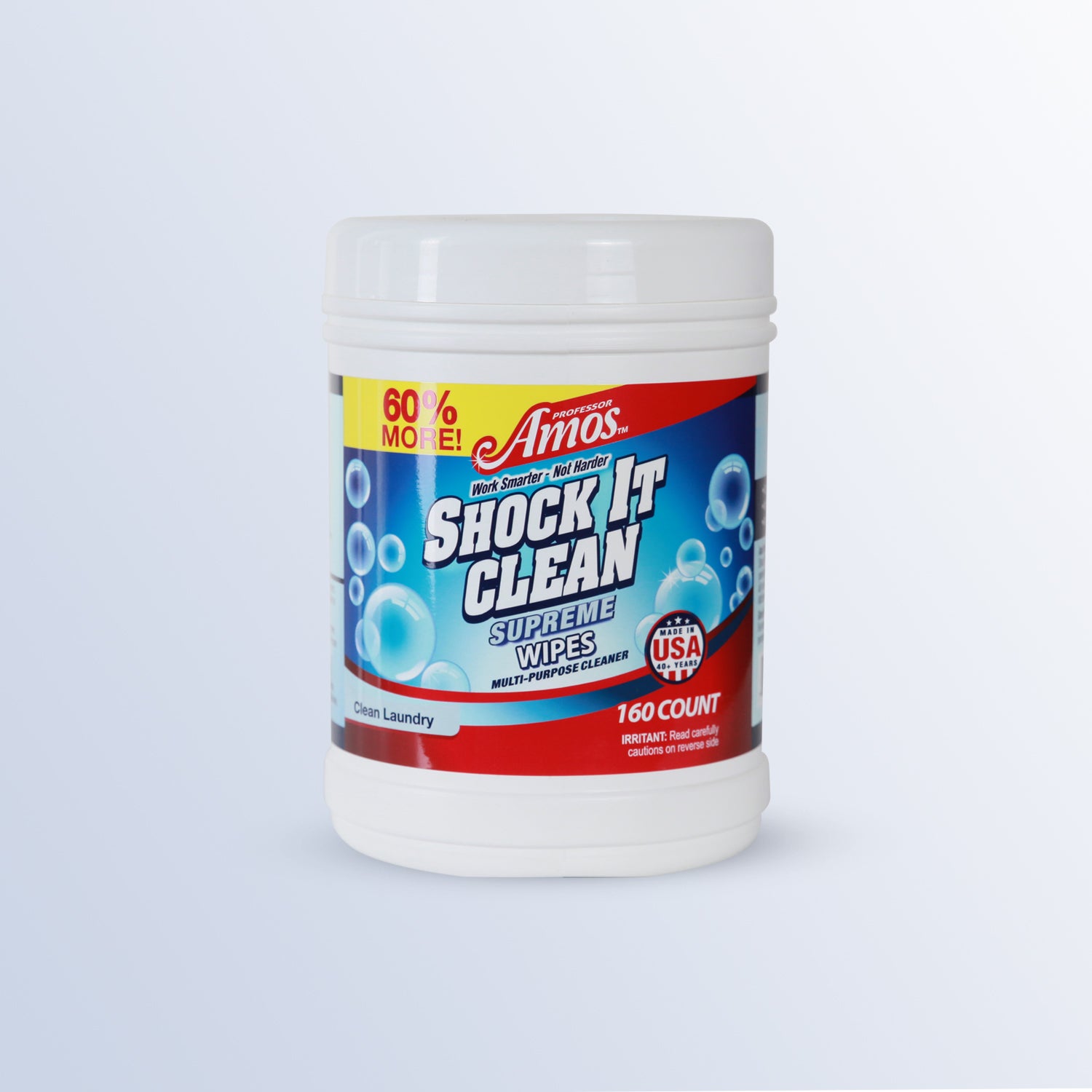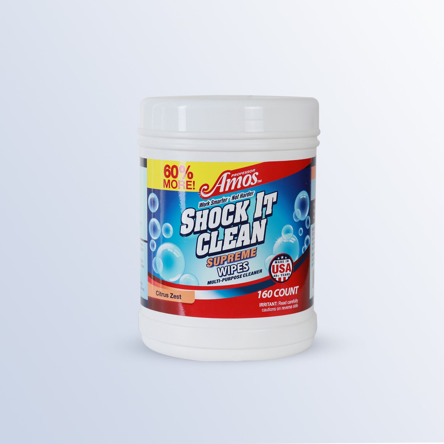 Tackle dirt and grime anywhere with Professor Amos Shock It Clean Wipes! These supersized, multi-purpose wipes are pre-moistened with Professor Amos' powerful cleaning formula, designed for use on a variety of surfaces indoors and outdoors.