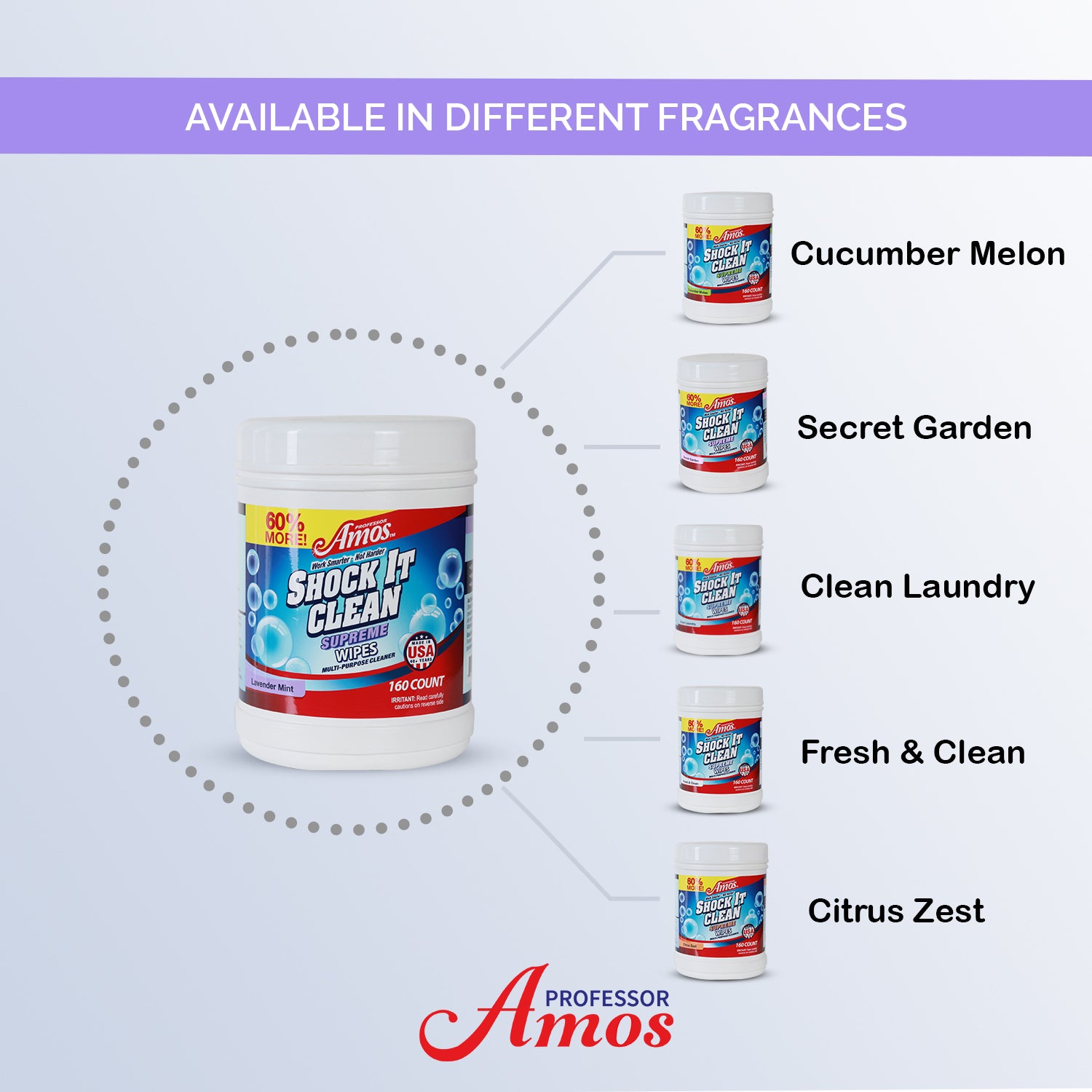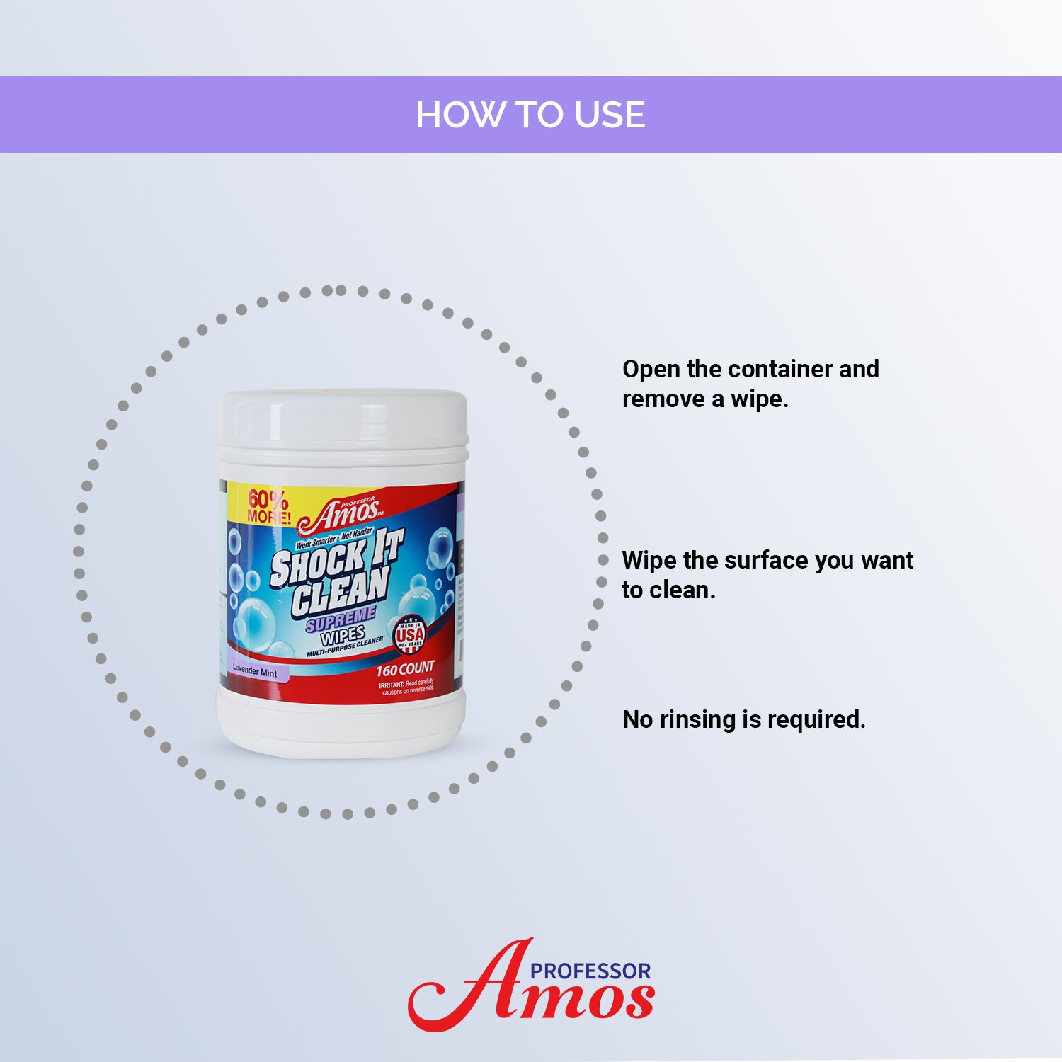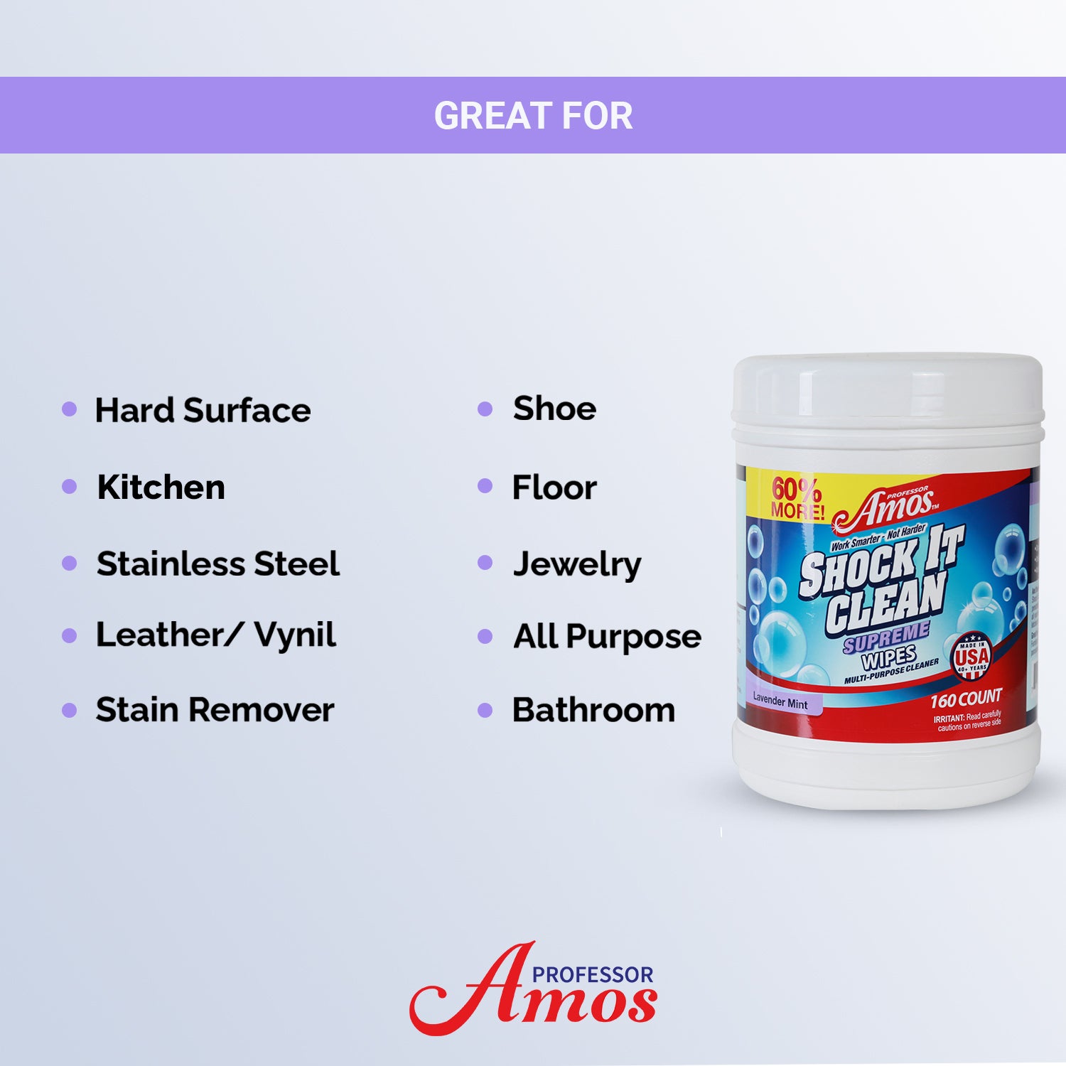 Tackle dirt and grime anywhere with Professor Amos Shock It Clean Wipes! These supersized, multi-purpose wipes are pre-moistened with Professor Amos' powerful cleaning formula, designed for use on a variety of surfaces indoors and outdoors.